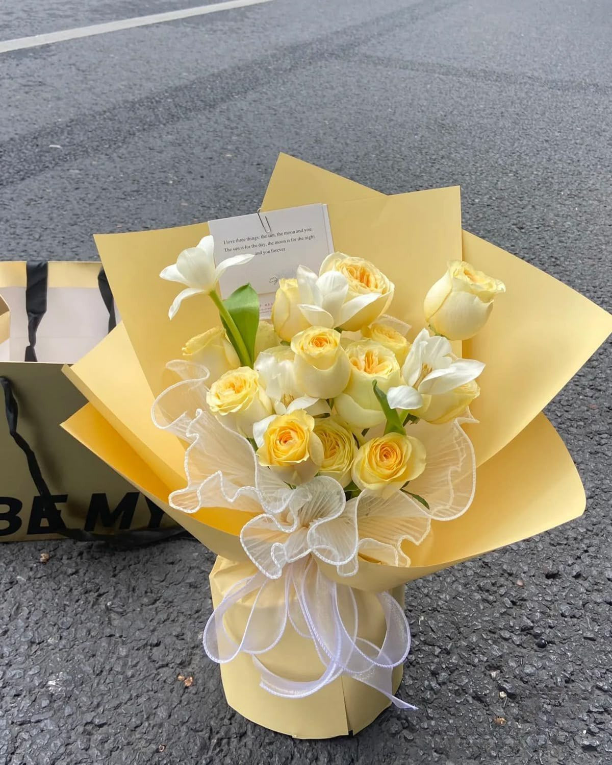 Common Flowers We Use: Pastel yellow ranunculus, pastel yellow roses, white roses, cream carnations, pastel colour tulips. Please note that the flowers differ each time, but the colour palette will be similar, because every bouquet is a unique individual, just like us humans!
